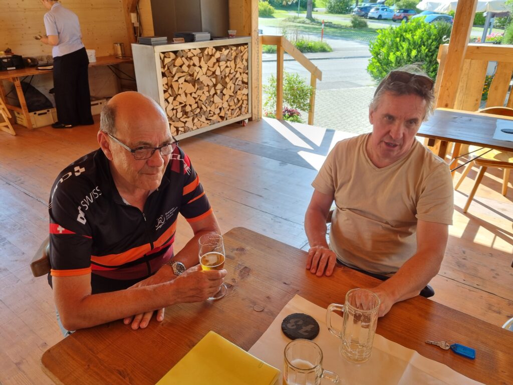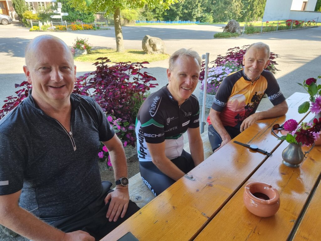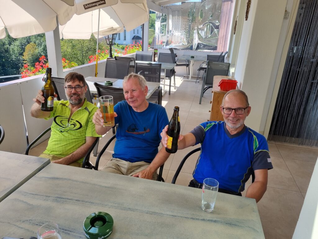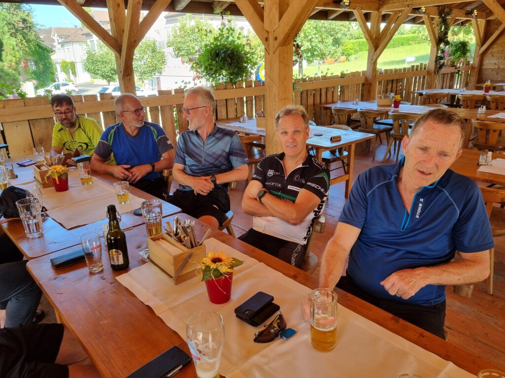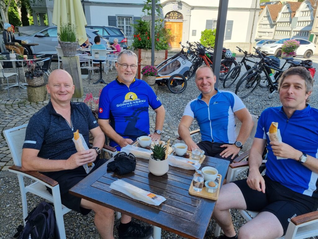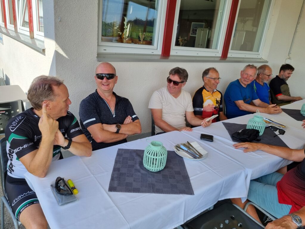 Dann ging es auf der Hauptstrasse weiter nach Bühler, Teufen und Niederteufen, wo wir dann auf Nebenwegen und Kiesstrassen unsere Fahrt fortsetzen konnten. Eine spezielle Erfahrung wartete dann auf uns, als wir eine sehr steile Abfahrt auf Kies vor uns hatten. Die 70 Höhenmeter abwärts beanspruchten unsere Bremsen sehr stark. Unten angekommen, ging es fast gleich steil aber auf Asphalt wieder 50 Höhenmeter hoch. Einen kurzen Schreckmoment hatte Beat, als ihm bei der Steigung die Kette raussprang. Aber gemeinsam konnte dieses Malheur behoben werden. Weiter ging es via St. Gallen Haggen und Boppartshof über die Velobrücke über die Sitter und mit Blick auf den Kybunpark nach St. Gallen Winkeln. Auf Nebenwegen passierten wir Gossau und landeten für den Mittagshalt bei der Brauerei & Hofstube Freihof. Die grosse Festwirtschaft im Freien war genau richtig für ein Bier und einen feinen Zmittag. Gestärkt fuhren wir auf Nebenstrassen weiter via Flawil und der Glücksfabrik «Chocolarium von Munz & Minor» nach Ober- und Unterrindal zu unserem Bierhalt in Lütisburg. Dazu mussten wir leider einen kleinen Umweg von knapp drei Kilometern machen und einige Höhenmeter zusätzlich überwinden, weil praktisch keine Restaurants geöffnet hatten.