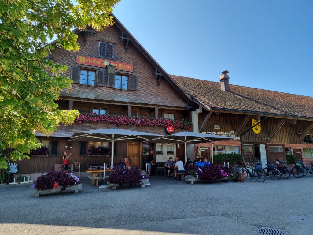 Der zweite Tag begann nach einer erholsamen Nacht mit einem reichhaltigen Frühstück. Um 09:00 Uhr wollten wir losfahren, aber einige scharrten bereits etwas früher mit den Hufen. Ich möchte dabei keine Namen nennen, gell Bruno. Rassig fuhren wir in Richtung Wil und verpassten ganz knapp die Einfahrt auf die Autobahn. Durch die Wiler Altstadt ging es weiter nach Rossrüti und Wuppenau. Dort wartete nochmals ein Aufstieg auf uns. Zum Glück kam dann schon bald unser Kaffeehalt in Heiligkreuz im Rest. Kreuz. Wunderschön abgelegen und herrlich zum Verweilen.