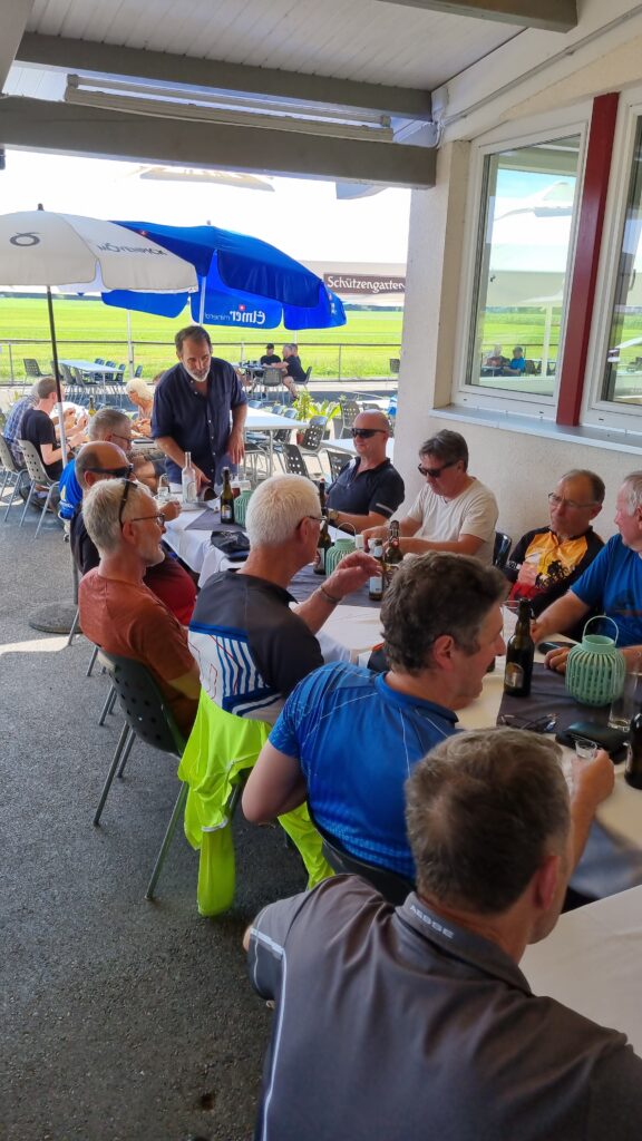 Vorbei an zwei wunderschönen Eseln mit ihrer Besitzerin fuhren wir dann weiter nach Bischofszell. Dazu überquerten wir auf einer alte Steinbrücke die Thur und sahen einige Fische rumschwimmen. In Bischofszell ging es nochmals kräftig aufwärts und weiter nach Sitterdorf und mit einer guten Sicht auf die startenden und landenden Flugzeuge auf dem Flugplatz Sitterdorf. Bei unserer Ankunft landeten ebenfalls einige Gleitschirmflieger. In Zafka’s Air Kitchen konnten wir uns beim Mittagshalt nochmals stärken. Leider blieb keine Zeit mehr den Mini-Zoo und den Freizeitpark mit den Bahnen zu besuchen. Vielleicht ist das eine Idee, um einmal privat hin zu fahren.