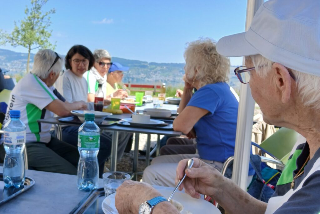 Nun trennten sich die Wege. Mit einer abwechslungsreichen Landschaft wurde die Wanderung vom Dorf zum Randenturm absolviert. Von Teerstrasse, Waldstrasse und Wald- und Wiesenweg, war die Strecke wie die Landschaft sehr abwechslungsreich. Mit stetiger Steigung wurden die Höhenmeter erklommen. Mit etwas Glück konnten einige Rehe von der Weite gesehen werden. Bevor der Zmittag eingenommen wurde, erklommen alle den Hagenturm, um die Aussicht von oben auf die Schweizer Alpen, die Schwäbische Alb und den Schwarzwald zu geniessen.