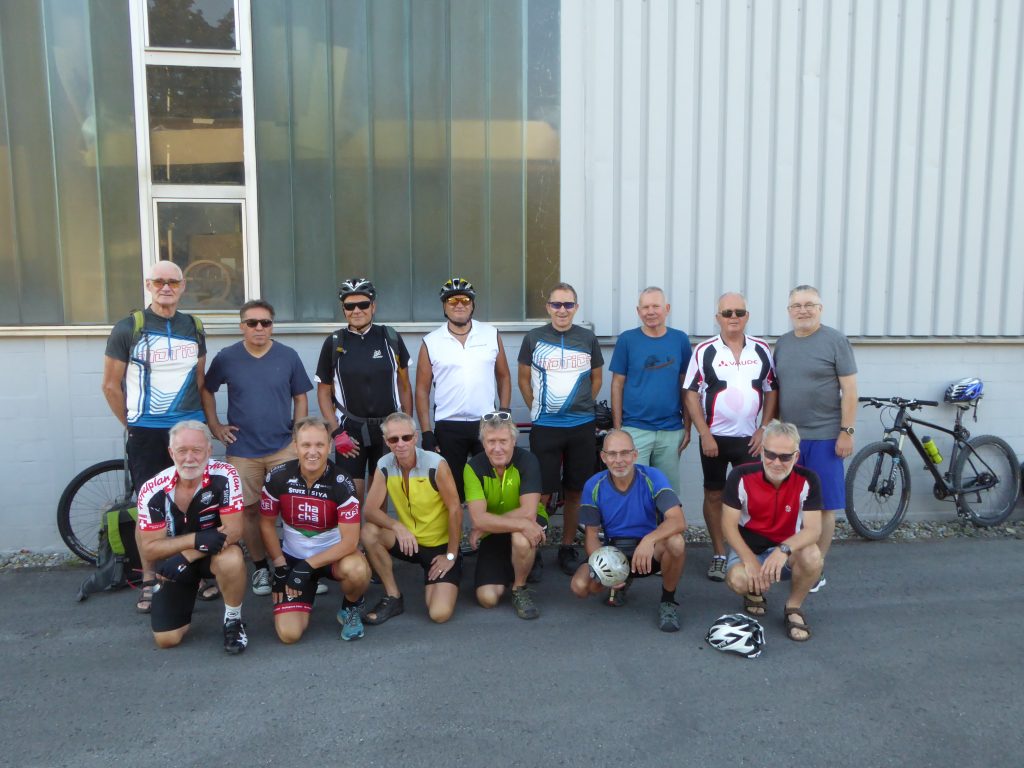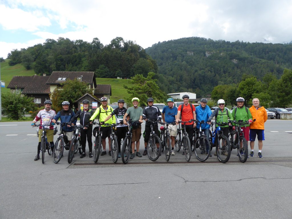 Mit Bike oder E-Bike trafen sich 13 Turner der Männerriege des TV Rebstein am Freitag, 19. August auf dem Progyplatz für ihren zweitägigen Ausflug nach Mels. Nachdem es mehrere Wochen nicht mehr geregnet hat, setzte genau zur Abfahrtszeit der starke Regen ein. Die Turner waren aber gut ausgerüstet und zogen den Regenschutz an.