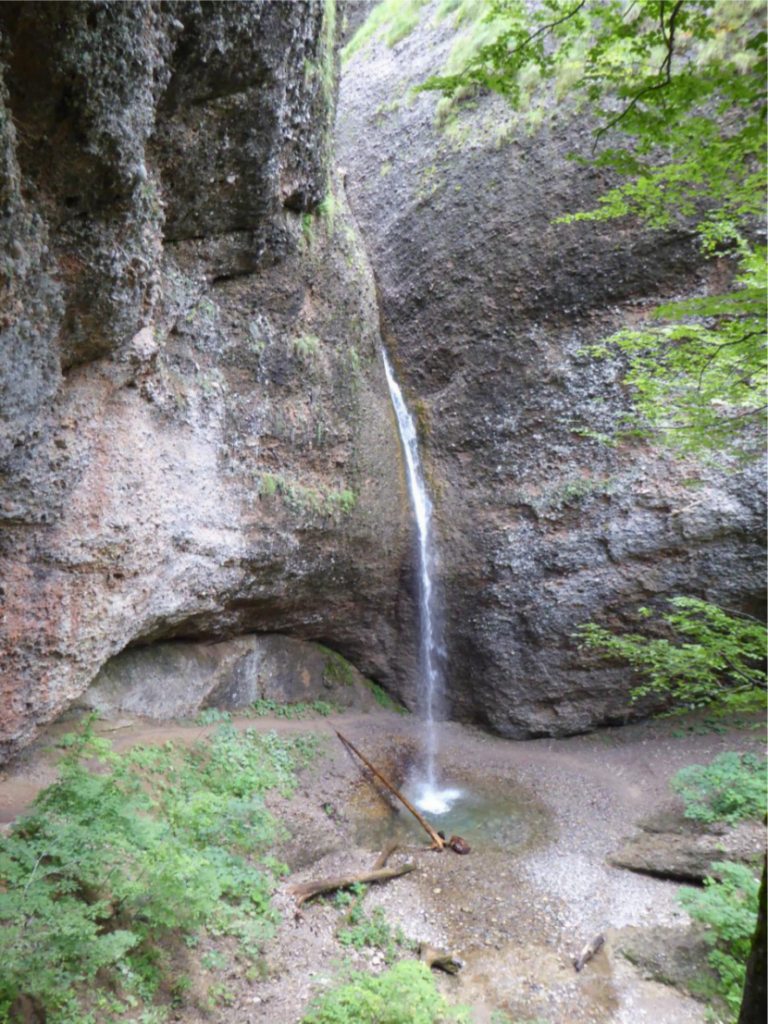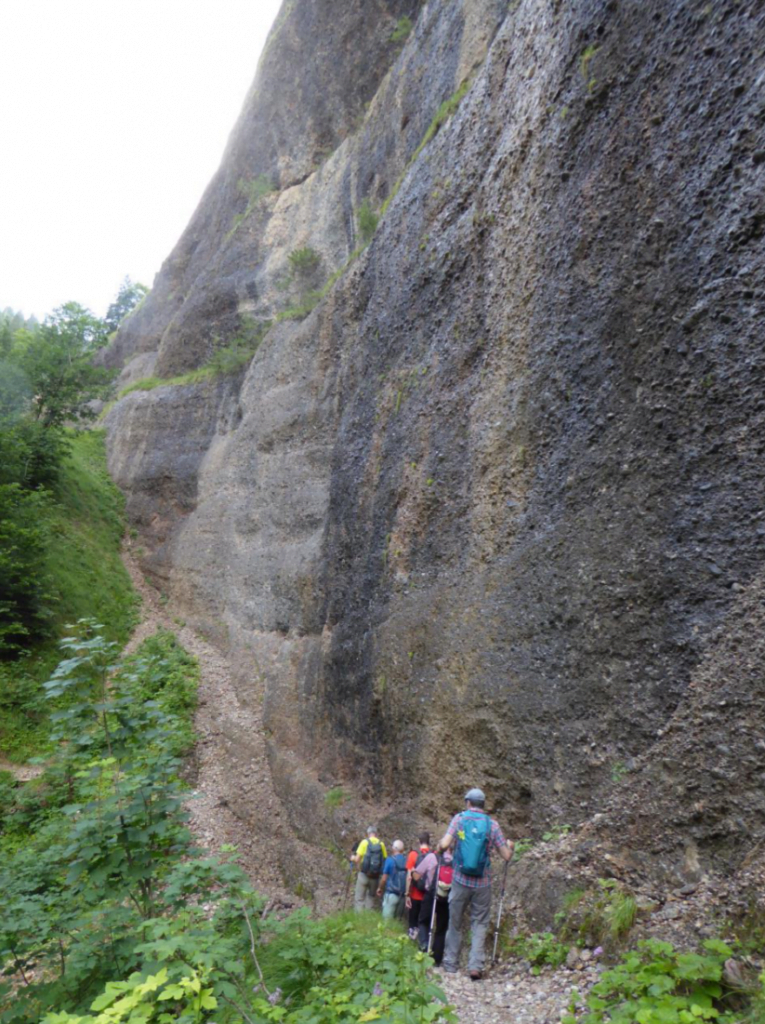 Nach einer kurzen Stärkungspause ging es weiter an einer imposanten Nagelfluh-Wand entlang zu unserem Mittagshalt bei der Hütte Neuwald auf 1317 müM. Die Verpflegung aus dem Rucksack schmeckte allen, denn jeder war ja selber dafür verantwortlich. Hier wurde das erste Mal ein kühlendes Bier vermisst. Für einige reichte es dennoch für einen kleinen Schluck aus dem Flachmann von Xävi, der mit feinem Sonnenbräu-Whiskey gefüllt war. Nach dem Mittagessen ging es bergab ins Ofenloch.