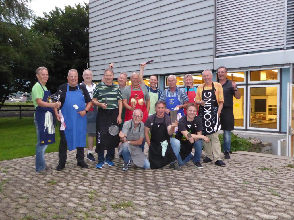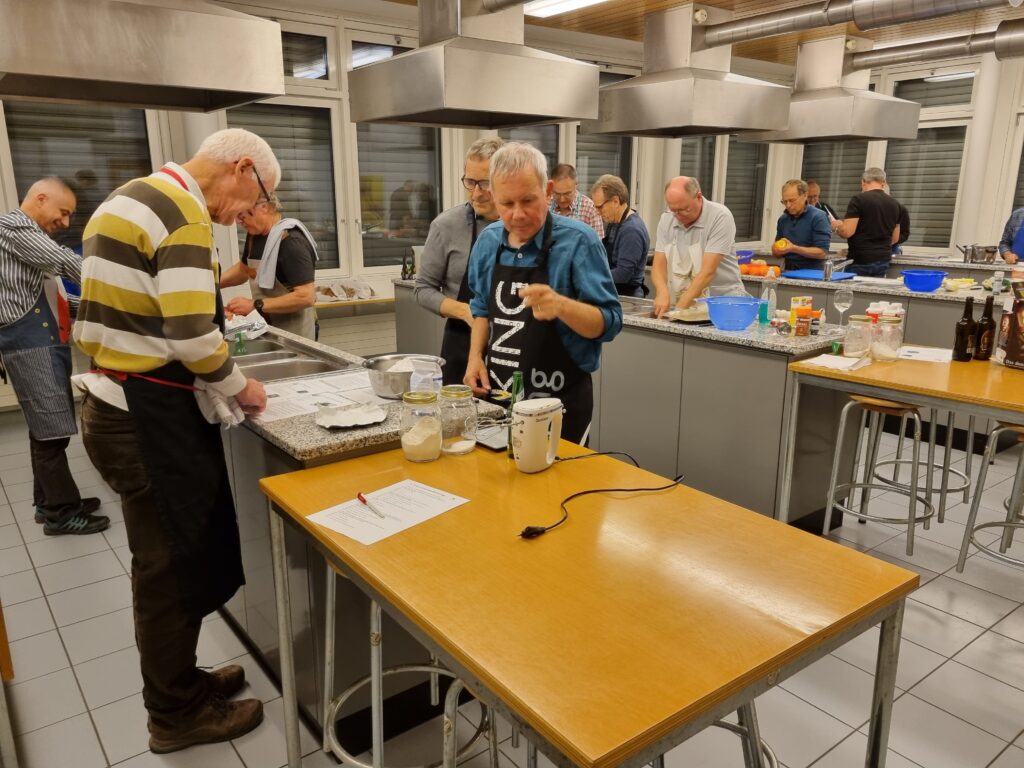 Mit Kochschürze und Geschirrtuch ausgerüstet trafen sich 14 gut gelaunte Männerriegler für einen geselligen Anlass mit Kochen und Geniessen. Gemeinsam sollte ein 5-Gang-Menü gekocht und verspeist werden. Zum Start wurden Apéro-Häppli aus Pizzateig mit Wursträdli gebacken und mit Weisswein serviert. Die Rieslingsuppe aus dem Zürcher Weinland schmeckte ebenfalls wie der Caesar-Salat mit gehobeltem Sbrinz. Zum Hauptgang wurden geschmorte Pouletschenkel im Wermut-Rahm mit Creme-Polenta und grünen Tagliatelle gekocht. Der Rotwein passte hervorragend dazu. Zum Dessert wurde Schokoladenmousse mit selbstgemachten Sablés serviert. Zum feinen Essen gehört natürlich auch das gemeinsame sauber machen. Ein herzlicher Dank gilt dem Chefkoch Roger für die genauen Kochanleitungen und die perfekte Organisation.
