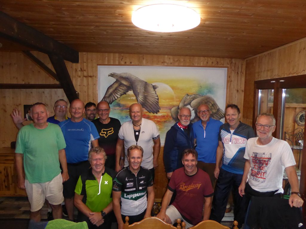 Am zweiten Tag wartete ein ausgiebiges Frühstück auf die Biker und der Regen hatte sich in der Nacht eingestellt. Dafür gesellte sich ein weiterer Turner zur Gruppe, die nun wieder aus 13 Bikern bestand. Bei trockenem Wetter und relativ angenehmen Temperaturen wurde die Rückfahrt zuerst auf dem Rheindamm in Angriff genommen. Ein erster Halt wurde in Weite in einem kleinen aber freundlichen Stübli eingeschaltet. Eine kurze Verpflegung mit Nussgipfel oder Fleischkäse-Brötli kräftigte die Gruppe für den zweiten Abschnitt.