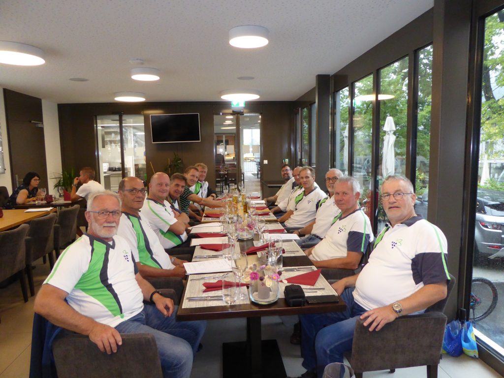 Auf bekannten Wegen fuhren die acht Turner mit E-Bike und die sechs Turner auf Velos ohne Unterstützung los. Via St. Margrethen und Rheineck nach Rorschacherberg, wo bereits ein erster Halt notwendig wurde. Dann ging es weiter nach Goldach, Tübach auf den gut markierten Veleweg Nr. 82. Kurz vor Dozwil wurde mitten im Wald in einer Buschenschenke der Mittagshalt gemacht. Alle waren froh, sich zu verpflegen und die verlorene Flüssigkeit wieder zu sich zu nehmen. Man musste die angenehmen Temperaturen noch geniessen, denn anschliessend stieg das Thermometer unaufhörlich an. Weiter ging es via Altnau mit wunderschönem Blick auf den Bodensee weiter bis zum Ziel in Kreuzlingen. Die Zimmer waren schnell bezogen und einige wagten sich zur Abkühlung in den Bodensee. Die anderen liessen die Beine baumeln und genossen ein wohltuendes Bier. Das gemeinsame Nachtessen wurde im Hotel eingenommen und anschliessend fanden die Turner noch eine Gartenbeiz, um den heissen Sommerabend ausklingen zu lassen.
